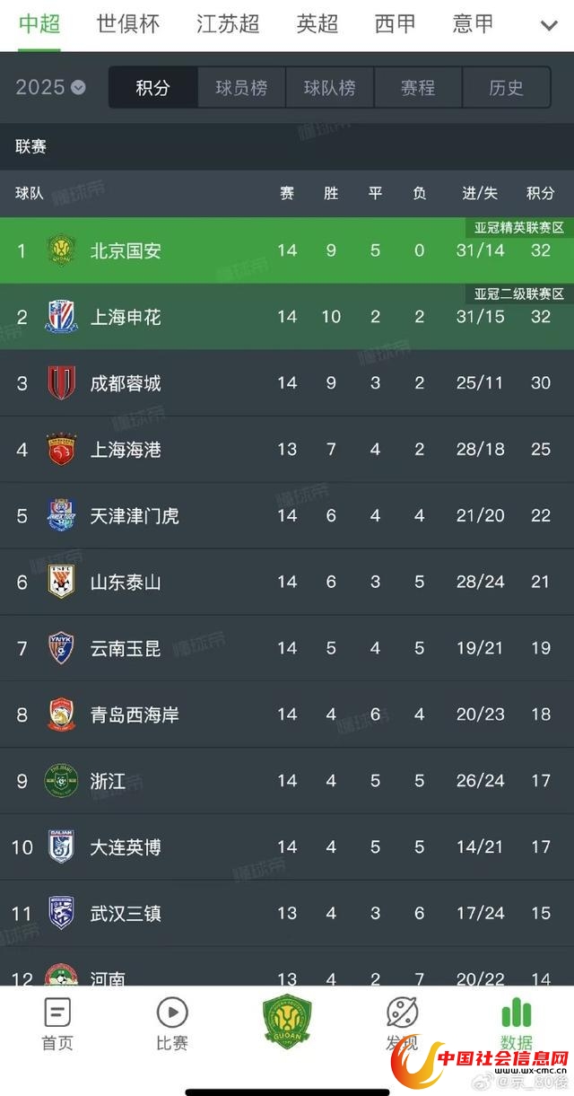目前中超踢完14轮,北京国安、上海申花和成都蓉城分列积分榜前三,积分分别是32、32分和30分。少赛一场的上海海港队暂积25分,但球队整体实力相比上赛季明显下滑,和前三名球队存在一定差距。