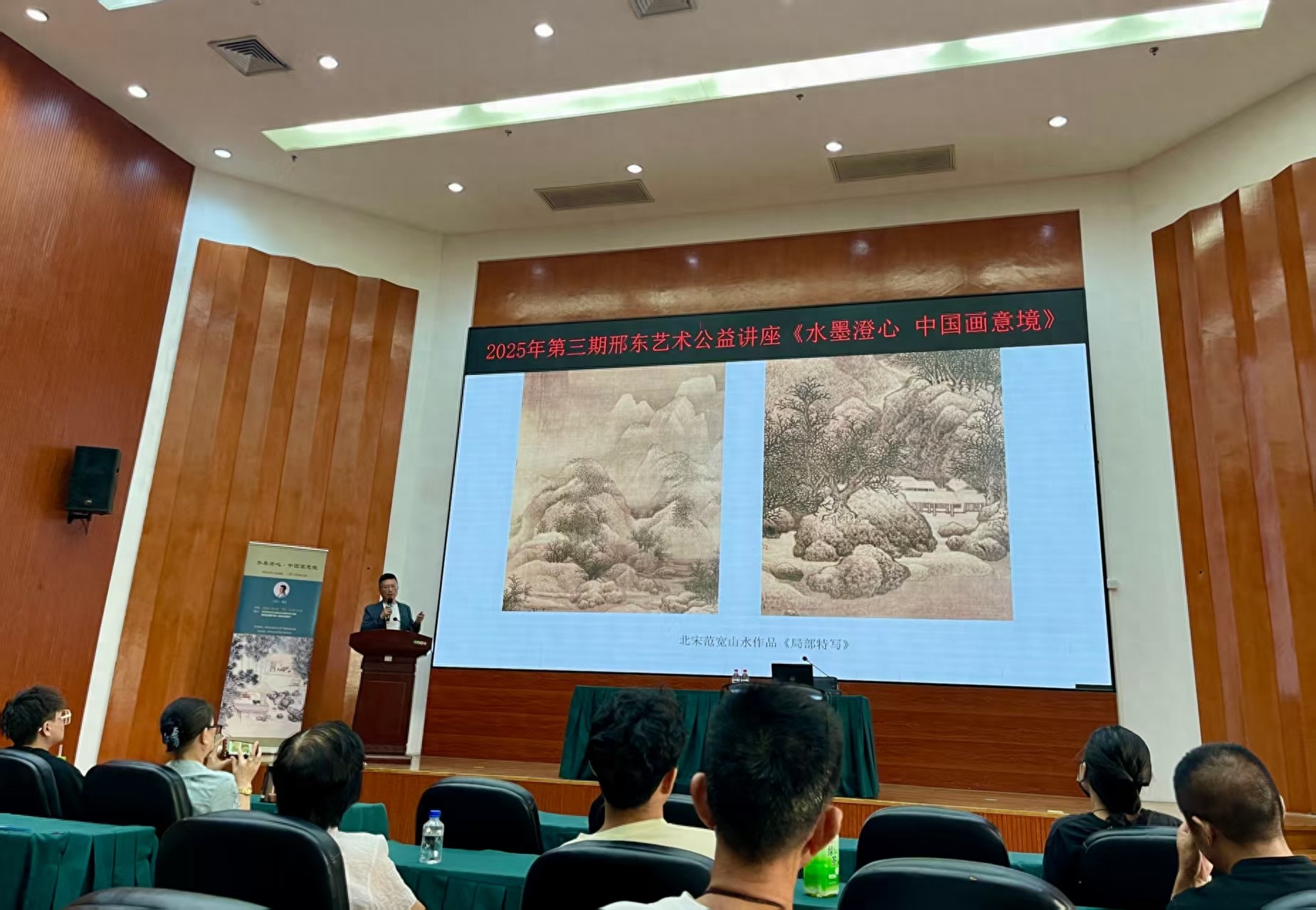 本次讲座中,邢东以其深厚的艺术造诣和丰富的创作经验,围绕 “水墨澄心,中国画意境” 这一核心主题,从理论与实践两个维度展开深入讲解。他指出,中国画的意境是画家通过笔墨、构图、色彩和诗词歌赋及文学等艺术语言,将自己的情感、思想与对自然、人生的感悟相融合,从而营造出的一种超越画面本身的精神境界。“水墨澄心” 不仅是创作的心境,更是中国画追求的至高境界,唯有澄净内心,方能在水墨交融间勾勒出天地万物的神韵。