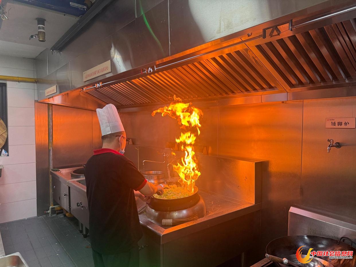 餐厅后厨呈现一派热火朝天的景象,师傅们在紧锣密鼓地筹备午餐。与室外灼人的热浪不同,这里的“热火朝天”透着浓浓的烟火气与人情味。大厨们正在烹制当日的夏日菜品:手撕包菜在锅中清脆作响,番茄炒蛋散发着酸甜的香气,清蒸鱼保持着鲜嫩的口感。