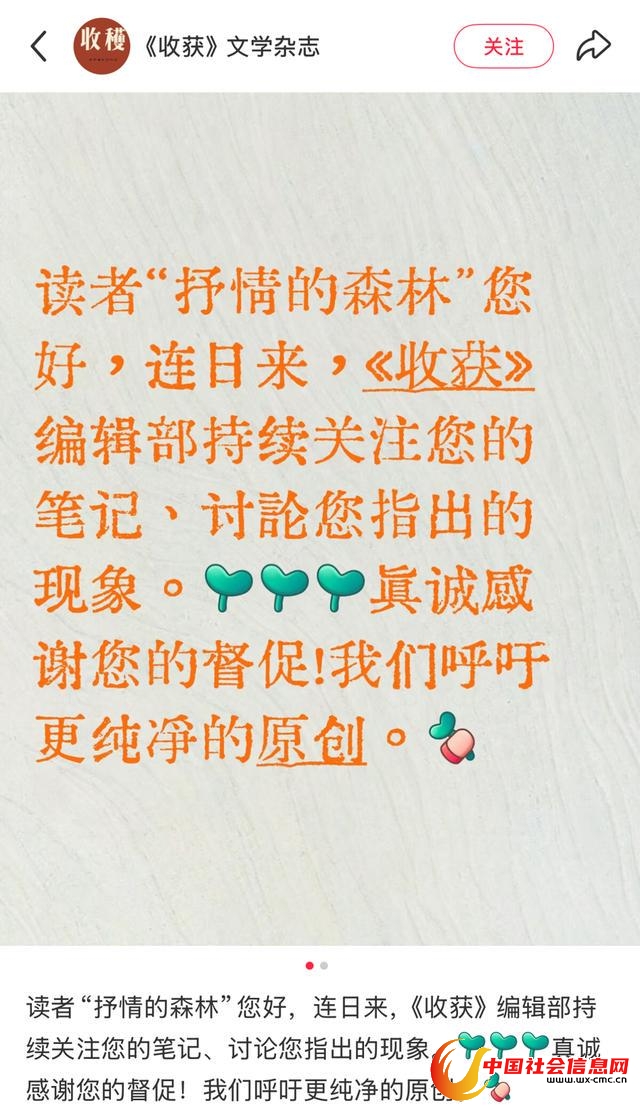在“抒情的森林”公开自己做对比的方法是通过查重工具之后,《收获》杂志回应“编辑部持续关注、讨论,真诚感谢督促”,“呼吁更纯净的原创”;《天涯》杂志声明“重提‘创造力’,拒绝抄袭”,“存在抄袭行为的(本刊)作者,一经发现,将予以公布谴责,刊物将拒绝刊发其任何作品”;《花城》杂志宣布,今年第4期起将启用查重软件辅助内容把关;《人民文学》杂志在以“尊重原创,推重新人,珍重读者”为主题的读者恳谈会上表示,“将把社会监督作为做好工作的动力,加大对来稿查重力度”,因为“原创性是文学生命力的根本所在”。