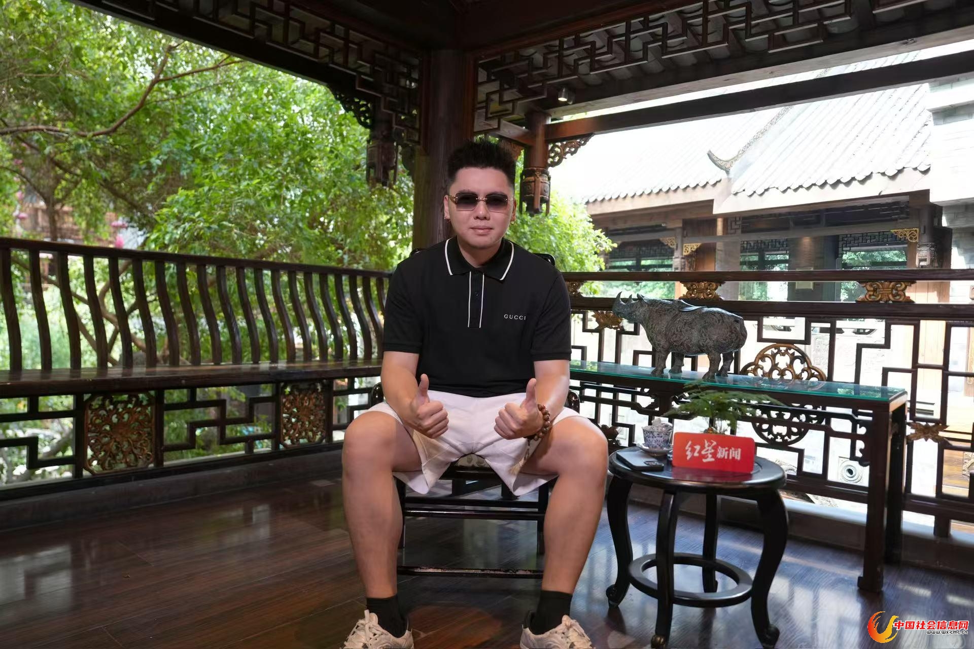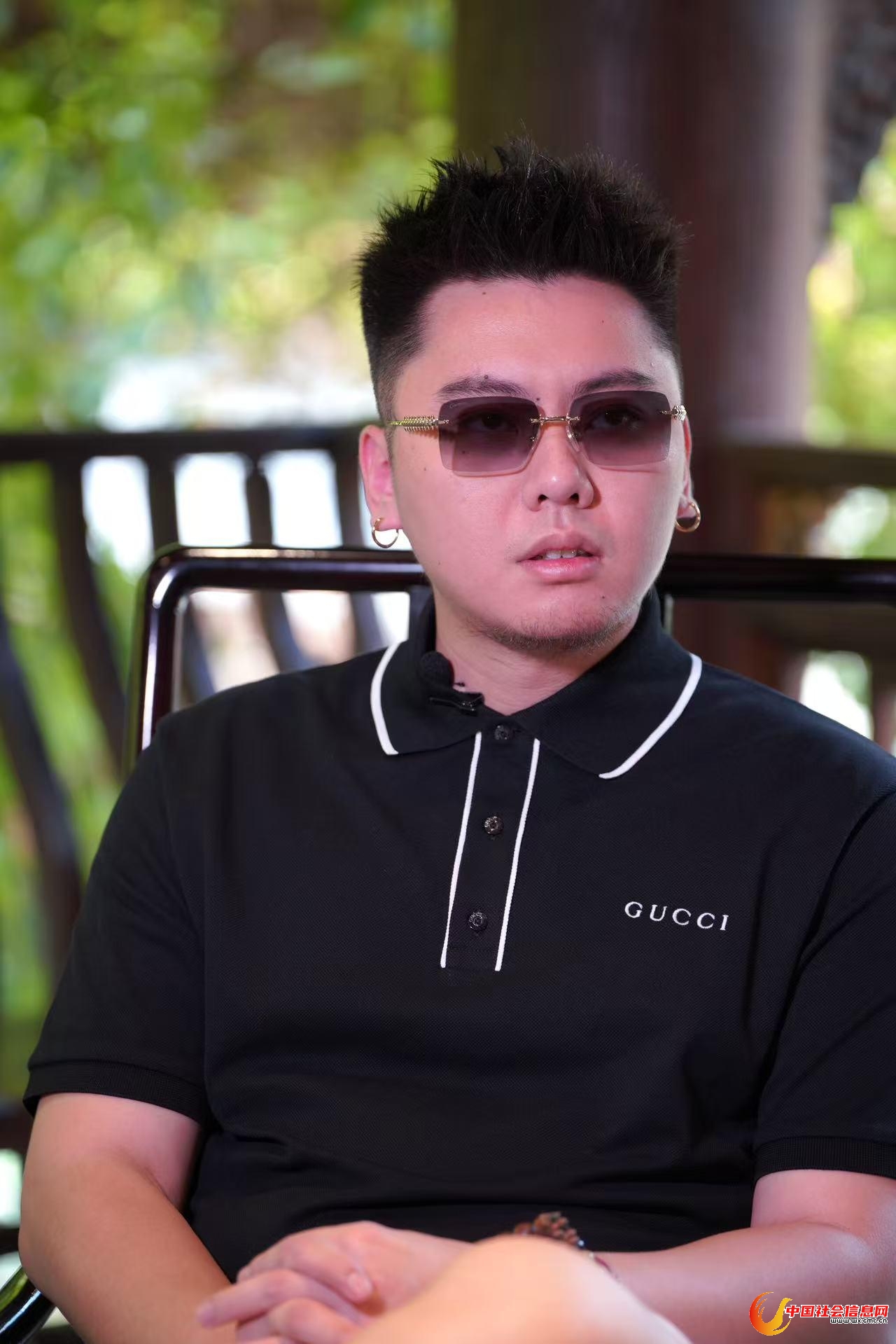 奢侈品牌Polo衫、十八子手串、金色耳环与墨镜,跷着二郎腿的那一刻,现实中的他,才和视频里的那个rapper重叠起来。