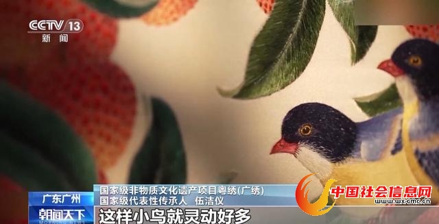国家级非物质文化遗产项目粤绣(广绣)国家级代表性传承人 伍洁仪:掌的纹路就是我们绣花的灵魂。做鸟的时候,爪子要有点力度、有骨头感,眼睛要有点玻璃体,有光线点睛。这样小鸟就灵动好多。