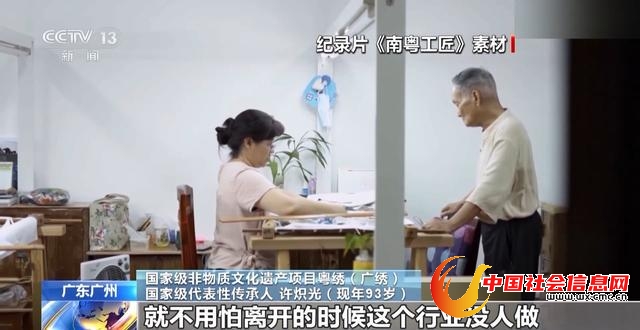 国家级非物质文化遗产项目粤绣(广绣)国家级代表性传承人 许炽光(现年93岁):现在我九十多岁,就不用怕离开的时候这个行业没人做、没人懂得做。