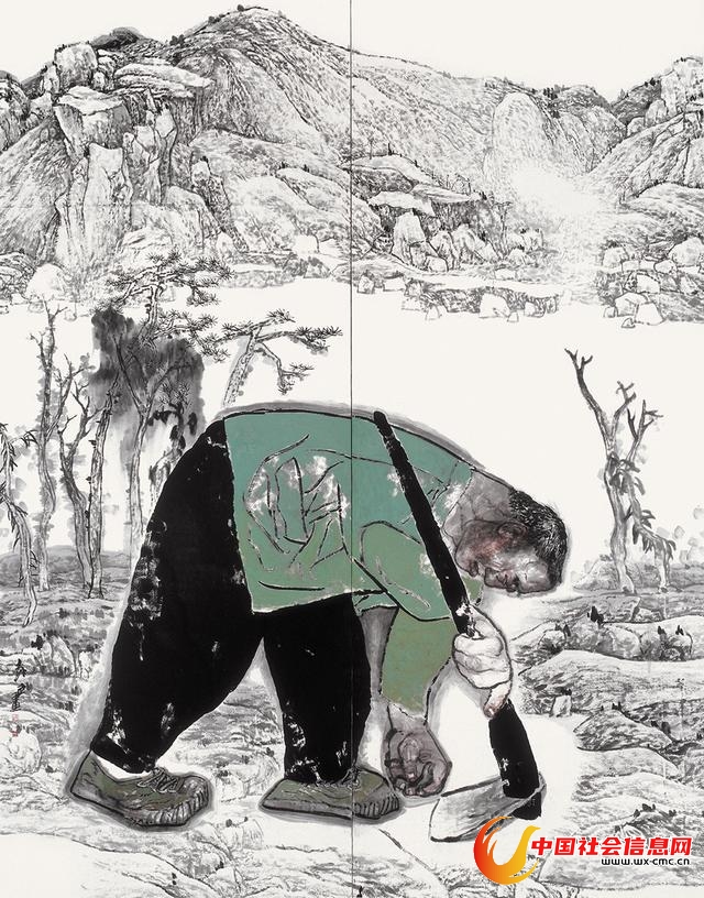 《在朱耷山水上耕种》看似画的是一个无知的农民在刨地,其实我想表达的是一些优秀的传统文化正在被破坏。这个系列我从十几年前就开始画了。
