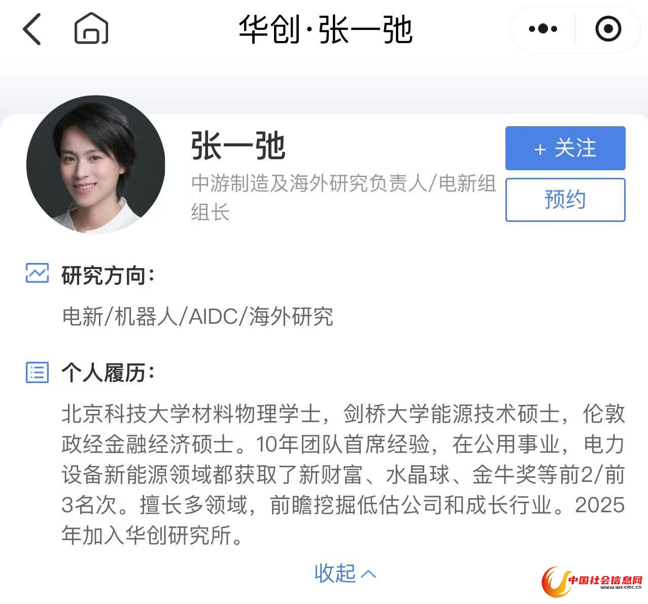 红星资本局查询“华创证券研究”微信公众号发现,张一弛的名字和简历已经出现,她的职务是中游制造及海外研究负责人、电新组组长,研究方向是电新、机器人、AIDC、海外研究。