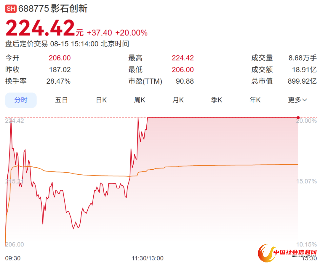 影石创新股价20CM涨停,报224.42元,市值900亿元