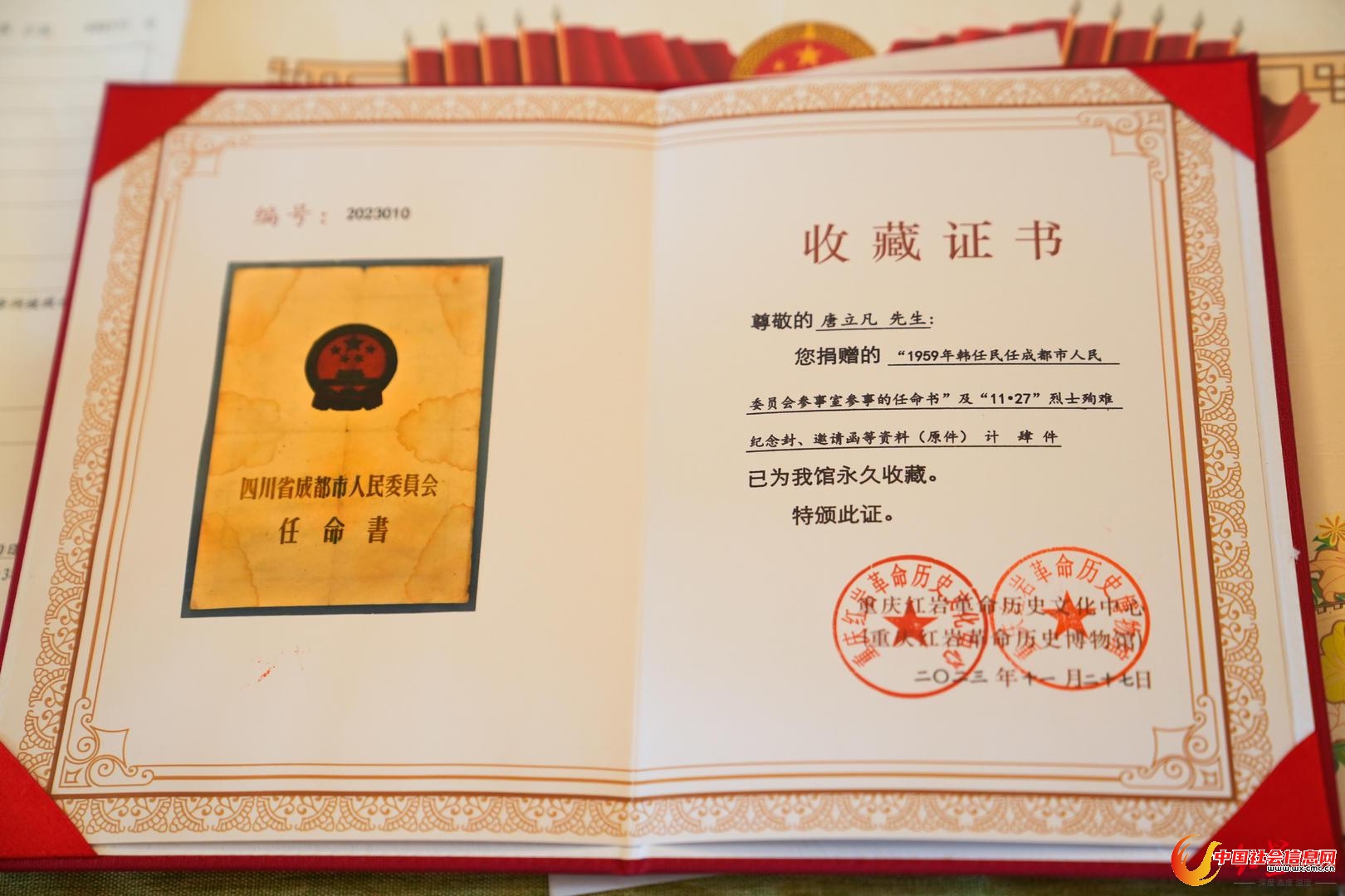 ▲韩子重外甥唐立凡捐赠韩子重先烈物品后收到的证明