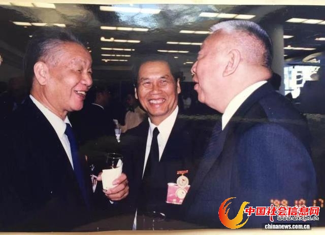 1999年10月17日重阳节当天,时任香港特区行政长官董建华(右一)、东江纵队港九独立大队老战士罗欧锋(中)和林鸣父亲、东江纵队港九独立大队老战士林传(左)畅谈。(资料图)(受访者供图)