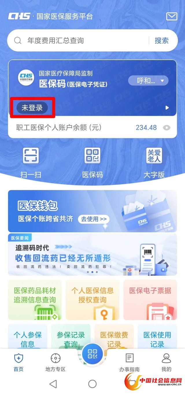 ■打开国家医保服务平台App,若是显示未登录,点击未登录登录即可登录(如果是首次登录,点击立即注册),若是已登录,忽略此步骤: