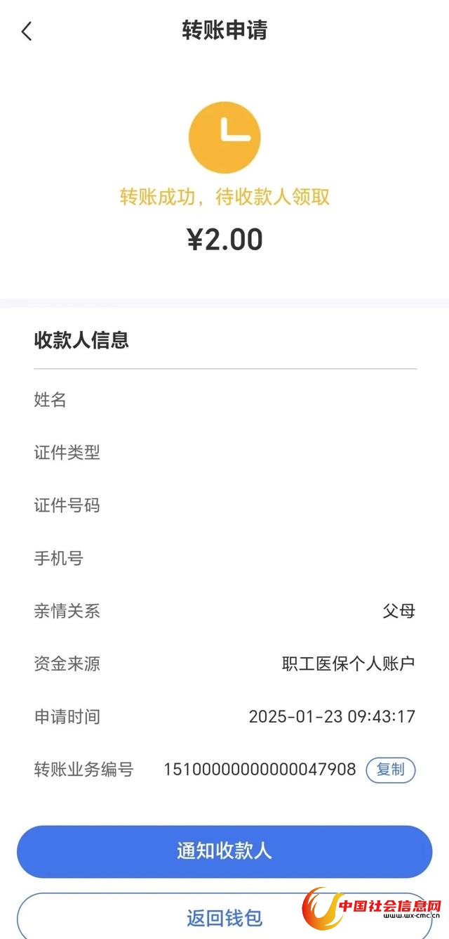 ■在钱包前面界面,点击医保钱包转账申请,填写被转账人基本信息,填写完成之后,点击提交,等待返回信息: