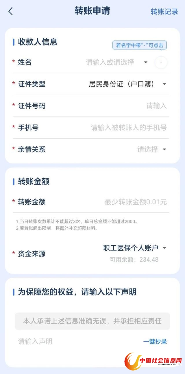 ■每个医保钱包账户单日限额三笔转账,每笔转账金额不超过2000元,每日22:00-次日6:00不能进行转账。