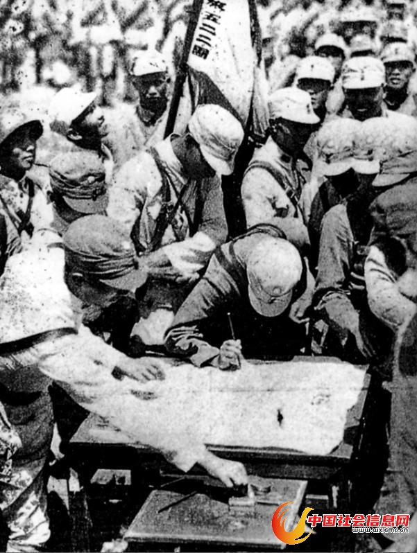 新华社发第5军第261旅全体官兵在誓词上签名。