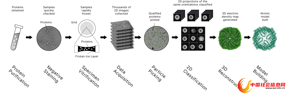 冷冻电镜单颗粒分析工作流程示意图