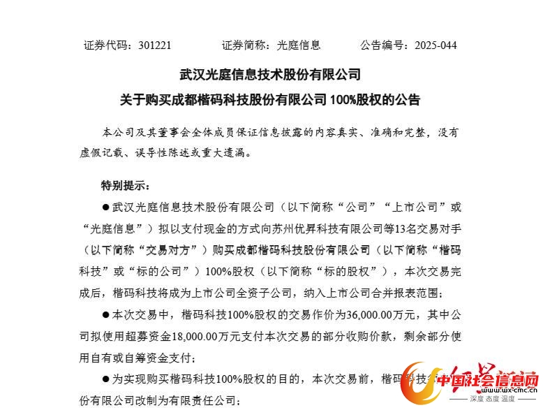 微成都报道6月10日晚间,光庭信息(301221.SZ)公告称,公司拟向苏州优昇科技有限公司等13名交易对方以支付现金的方式收购成都楷码科技股份有限公司(简称“楷码科技”)100%股份。本次交易作价为3.6亿元,其中光庭信息拟使用超募资金1.8亿元支付本次交易的部分收购价款,剩余部分使用自有或自筹资金支付。