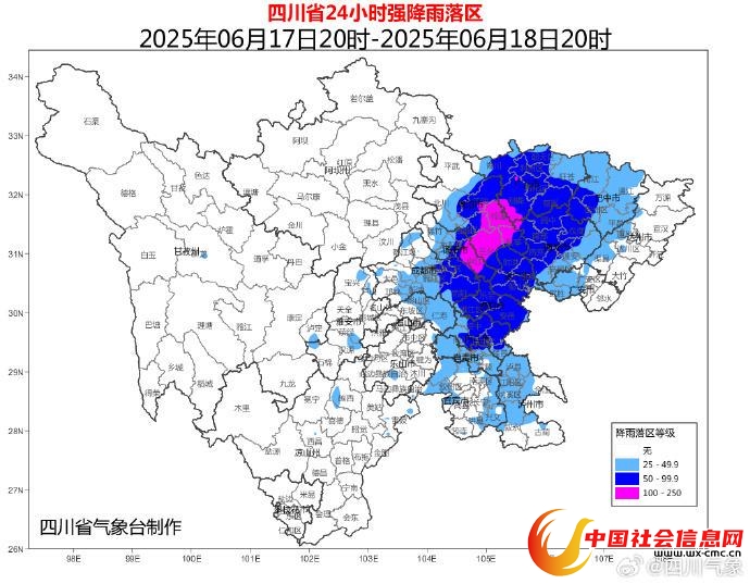 目前,四川省气象台6月17日15时40分已发布暴雨蓝色预警:6月17日20时到18日20时:盆地大部有阵雨或雷雨,其中广元、遂宁、资阳、内江4市和绵阳、德阳、成都3市中东部及南充、巴中2市西部有暴雨(雨量60~100毫米),局部有大暴雨(150~180毫米),最大小时雨量60~80毫米,雷雨时伴有短时阵性大风。
