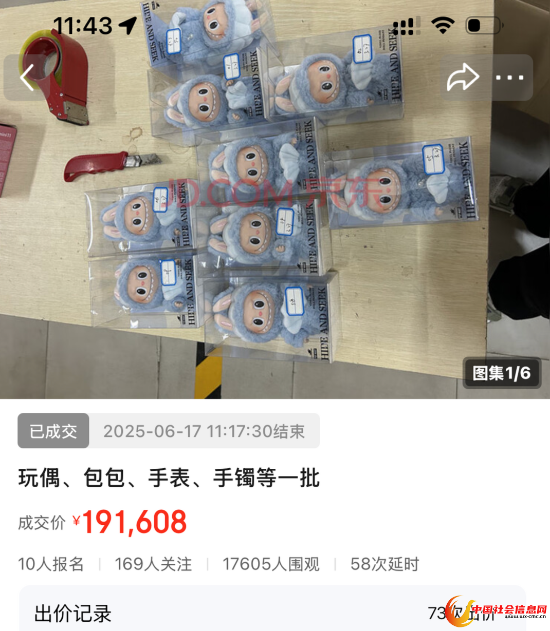 6月17日,一批被海关罚没的LABUBU玩偶、手表等在京东资产交易平台拍卖。经过73轮激烈竞价,最终以19.1608万元成交。