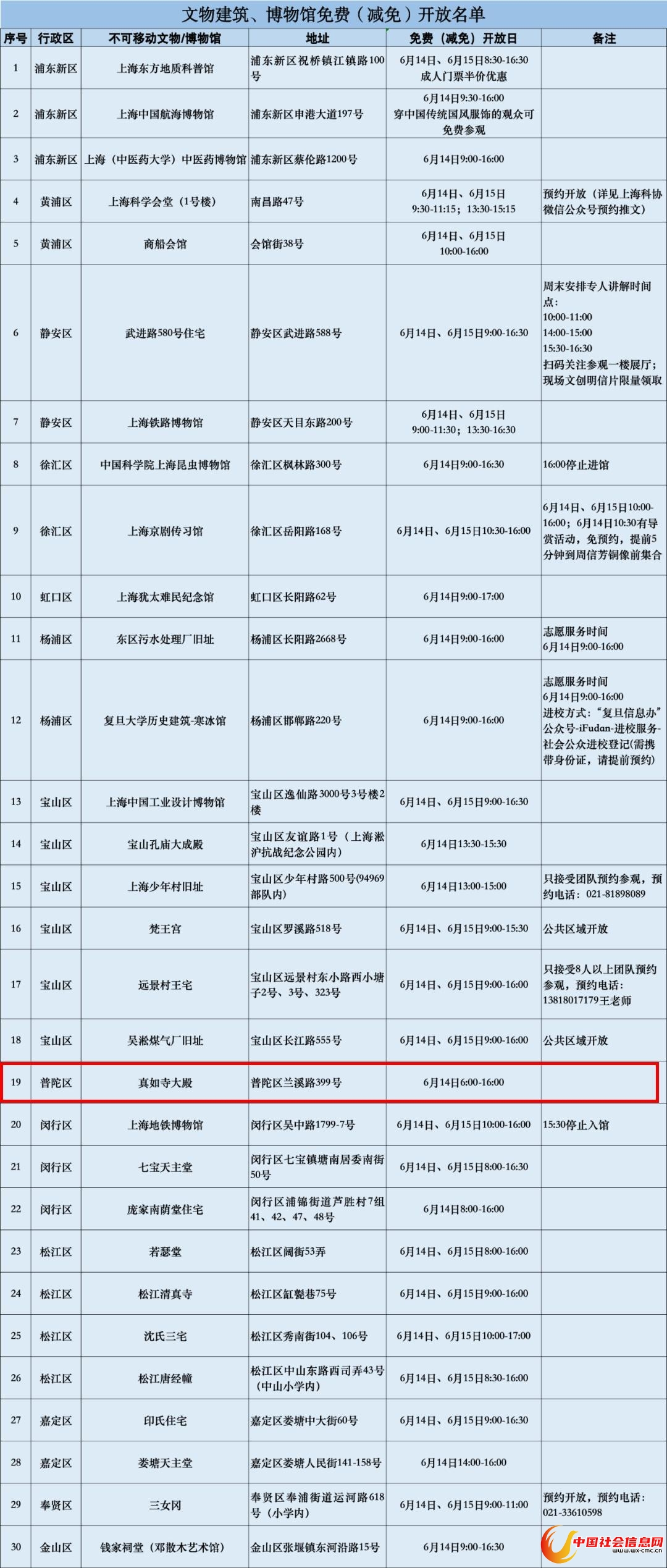 市文化旅游局介绍,6月14日(本周六)是我国的“文化和自然遗产日”,今年文化和自然遗产日主题是“让文物焕发新活力 绽放新光彩”。作为上海市文化和自然遗产日的特色活动,“文物建筑向社会免费开放活动”一直备受好评,今年共计30处文物建筑及博物馆将免费(减免)对公众开放。其中,复旦大学寒冰馆为修缮完成后首次对公众开放。具体开放名单详见↓