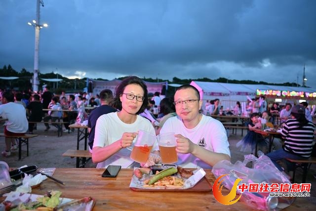 17时30分,夕阳余晖为沙滩镀上金边,海风带着咸湿气息拂面而来。随着音乐声响起,舞台灯光流转闪烁,与海面倒映的斑斓光影交相辉映,啤酒杯上跳动的泡沫折射出欢腾的光晕,现场热闹非凡。