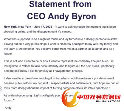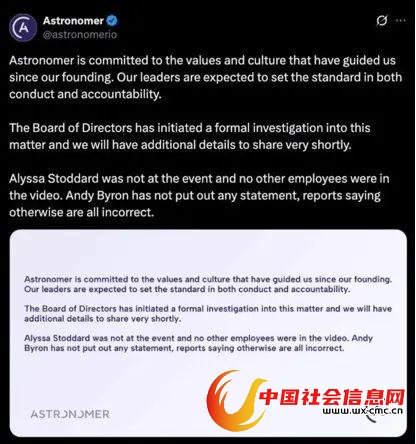 安迪所在Astronomer公司于7月18日通过LinkedIn发文表示,已对其CEO安迪展开正式调查。
