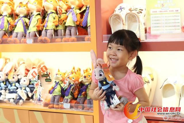 游客手拿周边产品——音乐棒棒糖,以“疯狂动物城”经典背景留影。