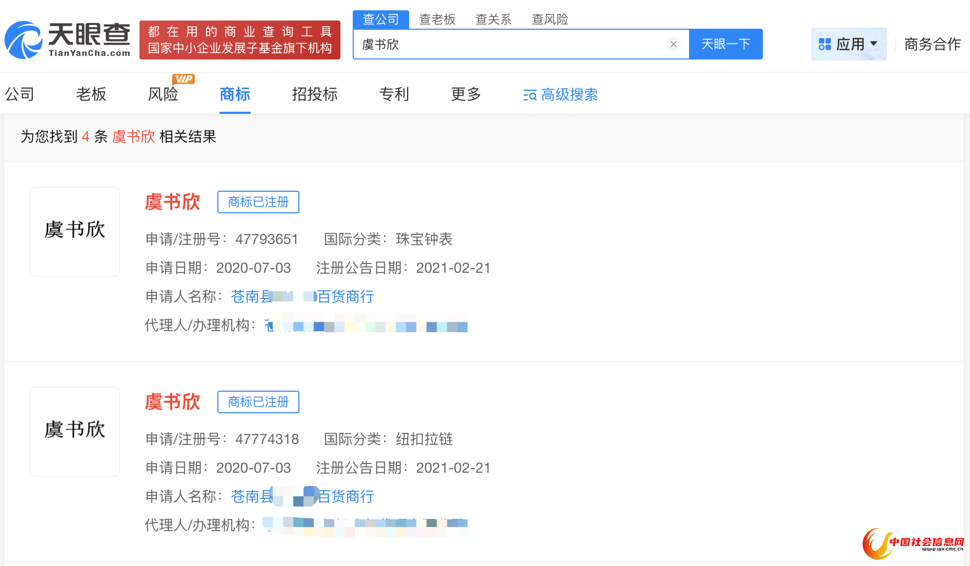 另据天眼查知识产权信息显示,“虞书欣”已于2020年7月被苍南县某百货商行申请注册为商标,国际分类涉及珠宝钟表、纽扣拉链,该商标于2021年2月成功注册。