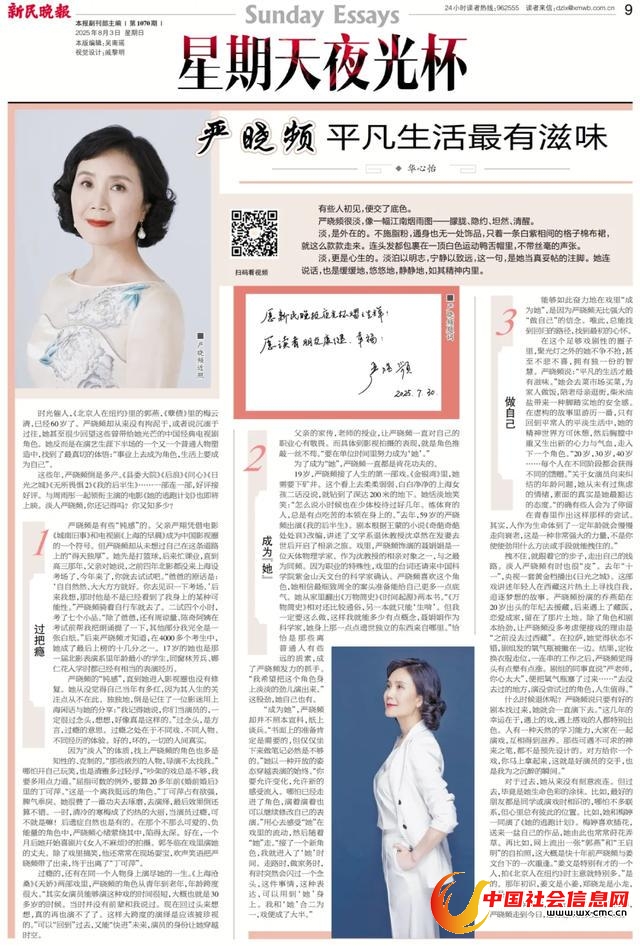 时光催人,《北京人在纽约》里的郭燕,《孽债》里的梅云清,已经60岁了。严晓频却从来没有拘泥于,或者说沉湎于过往,她甚至很少回望这些曾带给她光芒的中国经典电视剧角色。她反而是在演艺生涯下半场的一个又一个普通人物塑造中,找到了最真切的体悟:“事业上去成为角色,生活上要成为自己”。