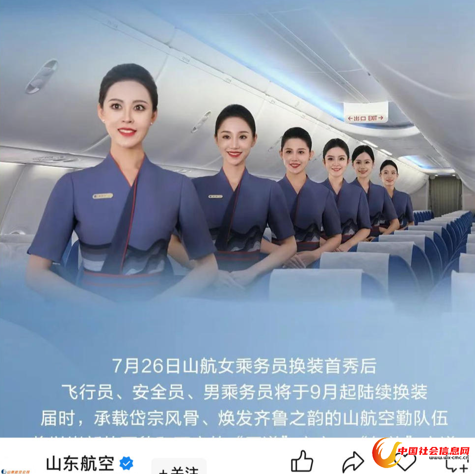 7月26日,山东航空新制服“青未了”亮相,新制服不仅融合了中国传统汉服元素,还遵循空乘实际需求与舒适体验,女空乘可自选裤装或过膝裙,轻便的平底鞋代替了以往的高跟鞋。