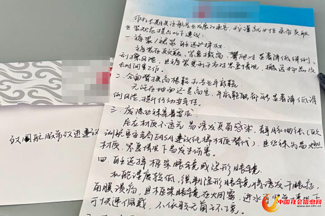 邓女士7月24日在乘坐飞机时,找乘务员要了意见信和笔,写下了关于女性乘务员职业服装5点建议:裤装裙装自主选择权,全面替换高跟鞋和专业平底鞋,废除丝袜穿着要求,自主选择框架眼镜或隐形眼镜,取消强制化妆规定。邓女士将自己手写的建议拍照发到了网上,引起了很多网友的讨论。