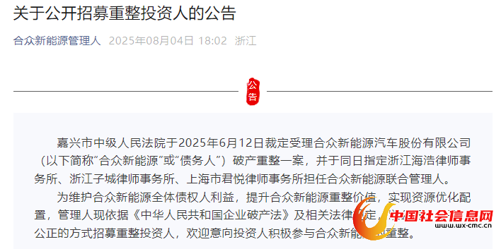 红星资本局8月4日消息,8月4日,合众新能源管理人公众号发布《关于公开招募重整投资人的公告》。