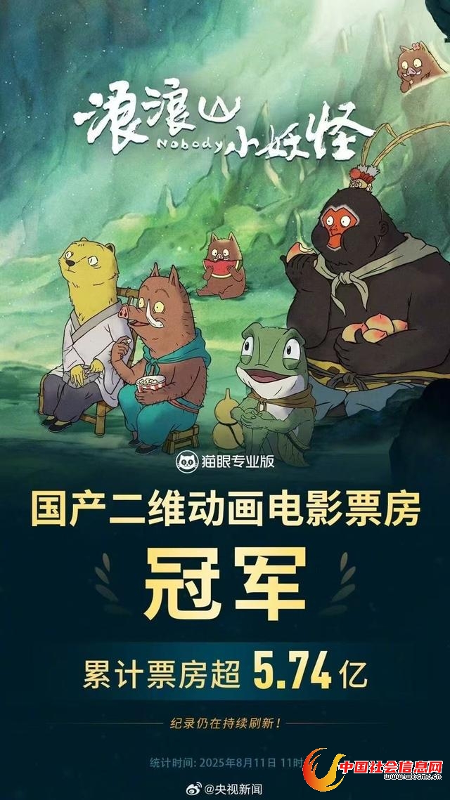 10天前,《中国奇谭》系列首部动画电影《浪浪山小妖怪》正式上映。仅仅10天过去,捷报传来,截至8月11日11时,动画电影《浪浪山小妖怪》累计票房突破5.74亿元,超过《大鱼海棠》5.73亿元,登顶中国影史国产二维动画电影票房冠军。