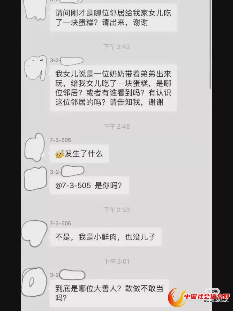 没想到这件事被女孩的妈妈知道了,不但没表示感谢和歉意,反而跑到业主群对贴主一家发难,不依不饶地质问到底是谁给自己女儿吃的蛋糕。