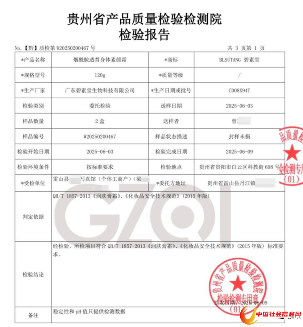 目前,梁先生已收到雷山县市场监管局委托贵州省产品质量检验检测院的部分产品检验报告,该报告显示,经检验,烟酰胺透皙身体素颜霜符合《润肤膏霜》及《化妆品安全技术规范》标准要求,各项卫生指标未检测出异常成分。