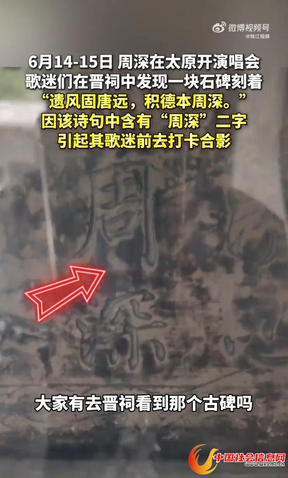 近日,有网友在社交平台发布视频称,在歌手周深太原演唱会期间,因晋祠一块石碑碑文中含有“周深”二字,很多歌迷前去打卡,甚至有人排队两小时才来到石碑前打卡合影。6月16日,晋祠景区工作人员表示,这两日因周深歌迷“打卡”,晋祠游客数量增多。该工作人员称,歌迷可凭演唱会门票在“中国晋祠”公众号提前预约,在演唱会前后三天可凭门票享受免费游览晋祠的福利。