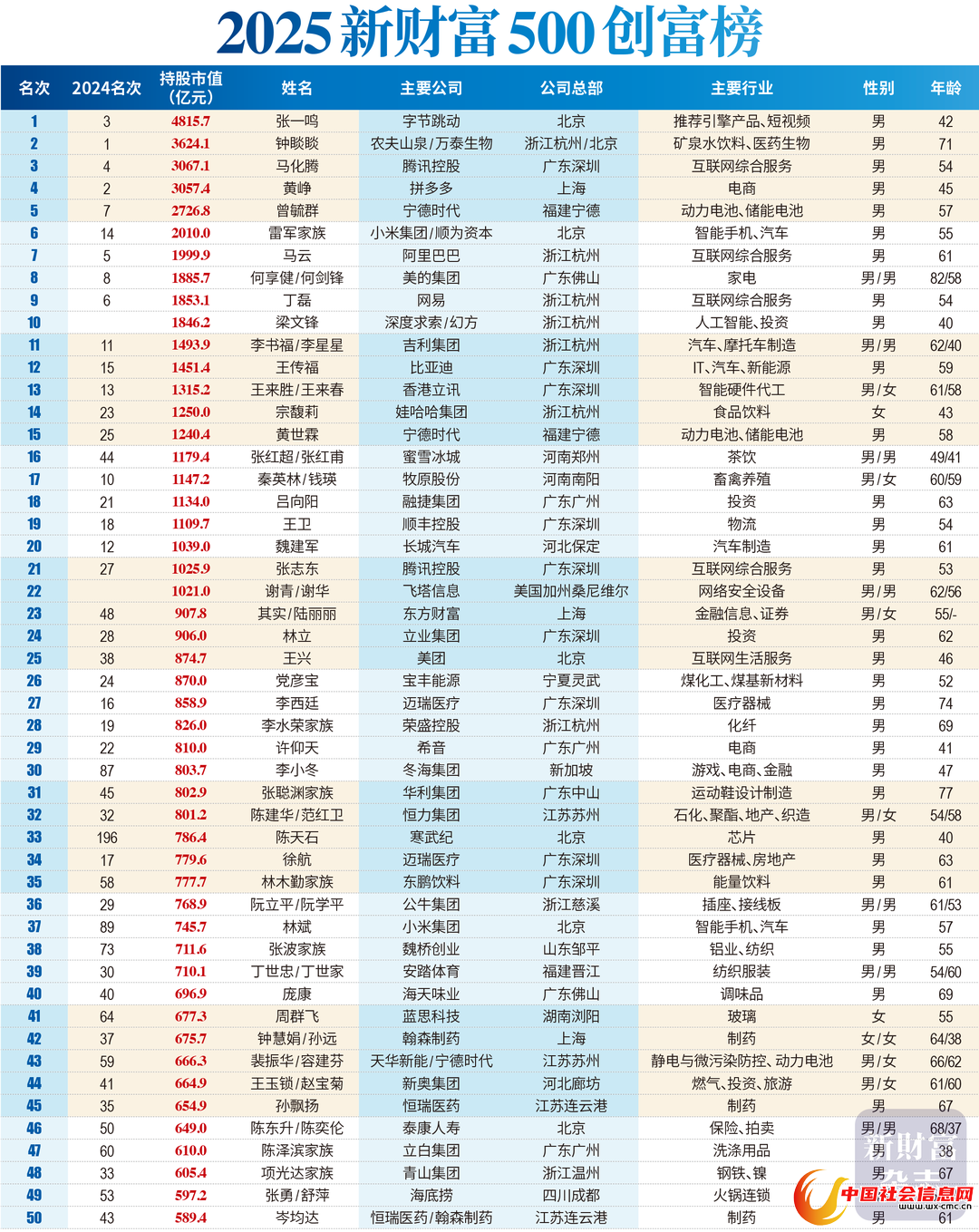 ▲2025新财富500创富榜前50名,图源:《新财富》杂志