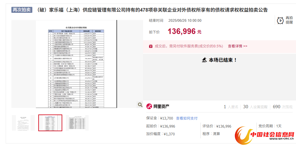 红星资本局6月28日消息,近日,家乐福(上海)供应链管理有限公司(下称“家乐福供应链公司”)持有的478项非关联企业对外债权的相关权益在阿里资产平台进行了拍卖。
