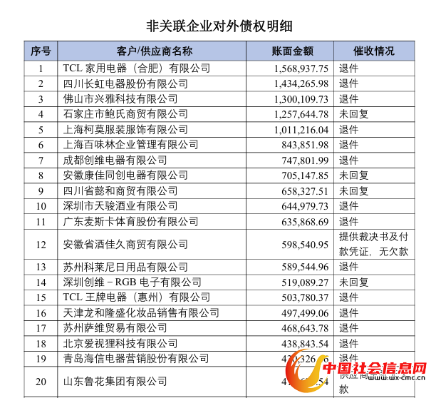 债权明细表显示,此次拍卖的对外债权共478项,涉及TCL家用电器(合肥)有限公司和四川长虹(600839.SH)等企业,账面上的债权总金额共约3301.11万元。