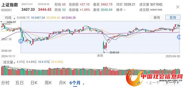当日收盘后,A股上半年正式收官。纵观2025上半年,沪指涨了2.76%,深成指涨了0.48%,创业板指涨了0.53%,科创50涨了1.46%,北证50涨了39.45%。