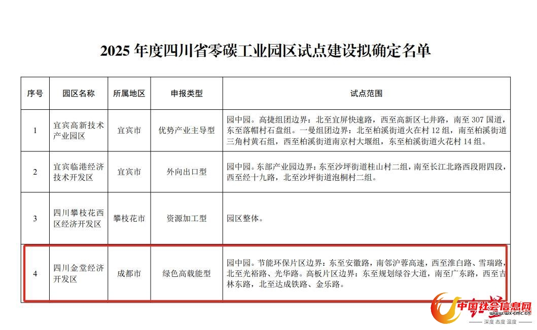 近日,四川省经济和信息化厅网站公示了《2025年度四川省零碳工业园区试点建设拟确定名单》,一共四个园区上榜,其中四川金堂经济开发区为成都唯一入选园区,公示时间为7月3日至7月9日。