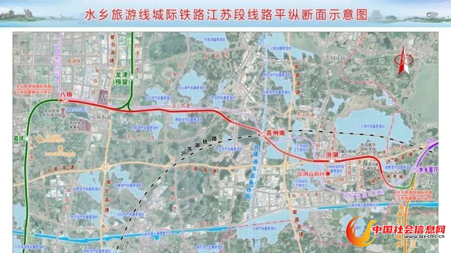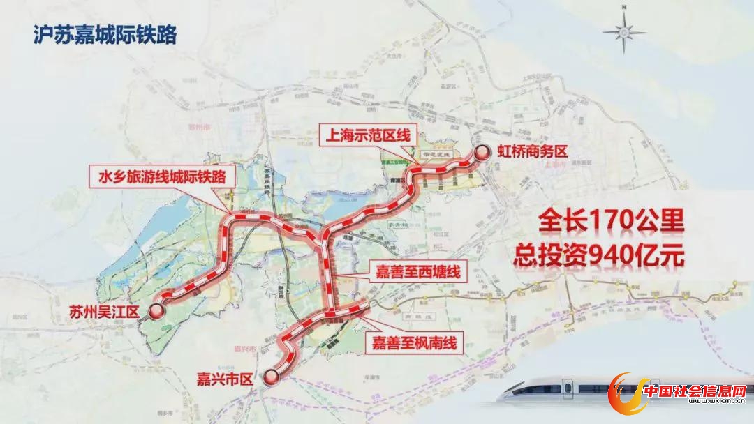 沪苏嘉城际铁路是推进示范区基础设施互联互通的标志性工程,包括上海市境内的上海示范区线,江苏省境内的水乡旅游线,浙江省境内的嘉善至西塘线和嘉兴至枫南线。其中,水乡旅游线是联接沪、苏、浙两省一市的重要跨省交通基础设施工程。