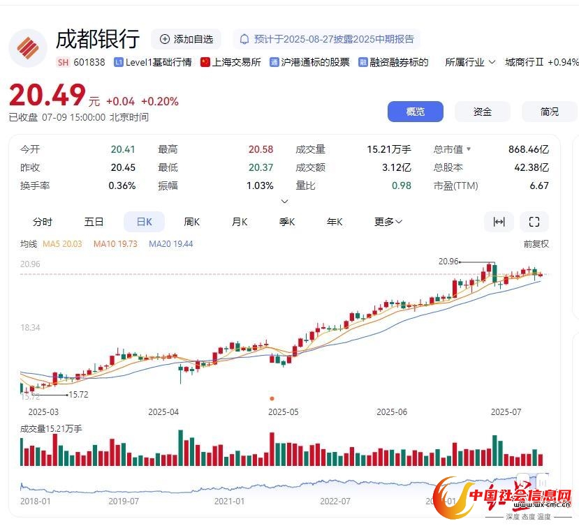 截至7月9日收盘,成都银行股价报20.49元/股。另外,本次增持计划规定了6个月的期限,目前距离增持计划到期已不到三个月时间。