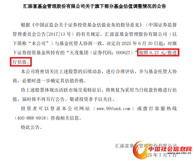 天茂集团股价已被一基金公司“打骨折”。7月1日,汇添富基金公告,对旗下证券投资基金所持有的“天茂集团”按照0.27元/股进行估值,这一估值相比停牌前股价2.74元,下调幅度超过90%。