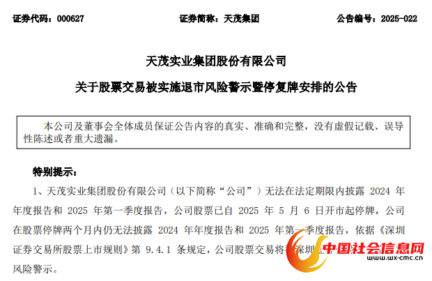 天茂集团7月6日公告称,因无法在法定期限内披露2024年年度报告和2025年第一季度报告,公司股票交易将被深圳证券交易所实施退市风险警示。
