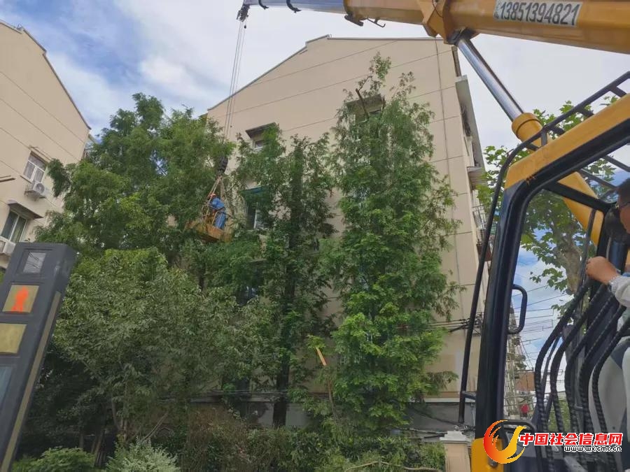 控江路1455弄小区,香樟树修剪中。