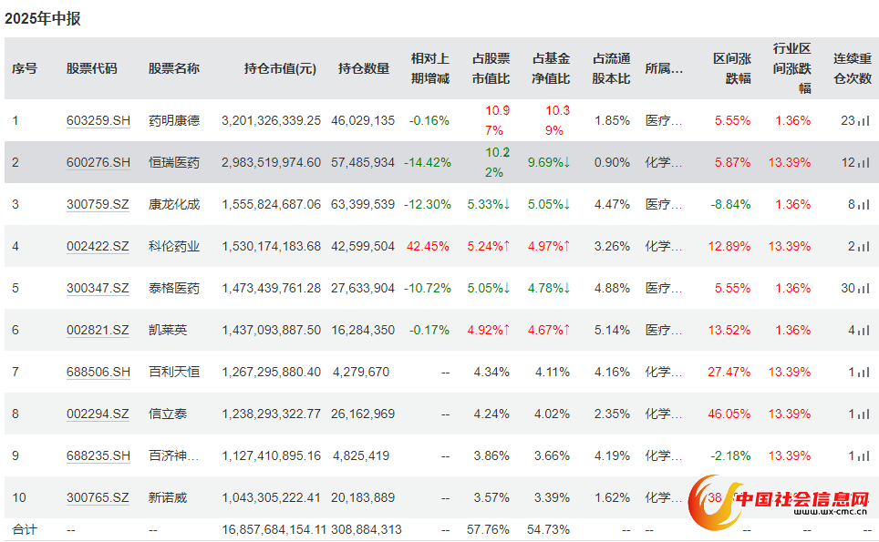 中欧医疗健康二季度末前十大重仓股 截图自wind