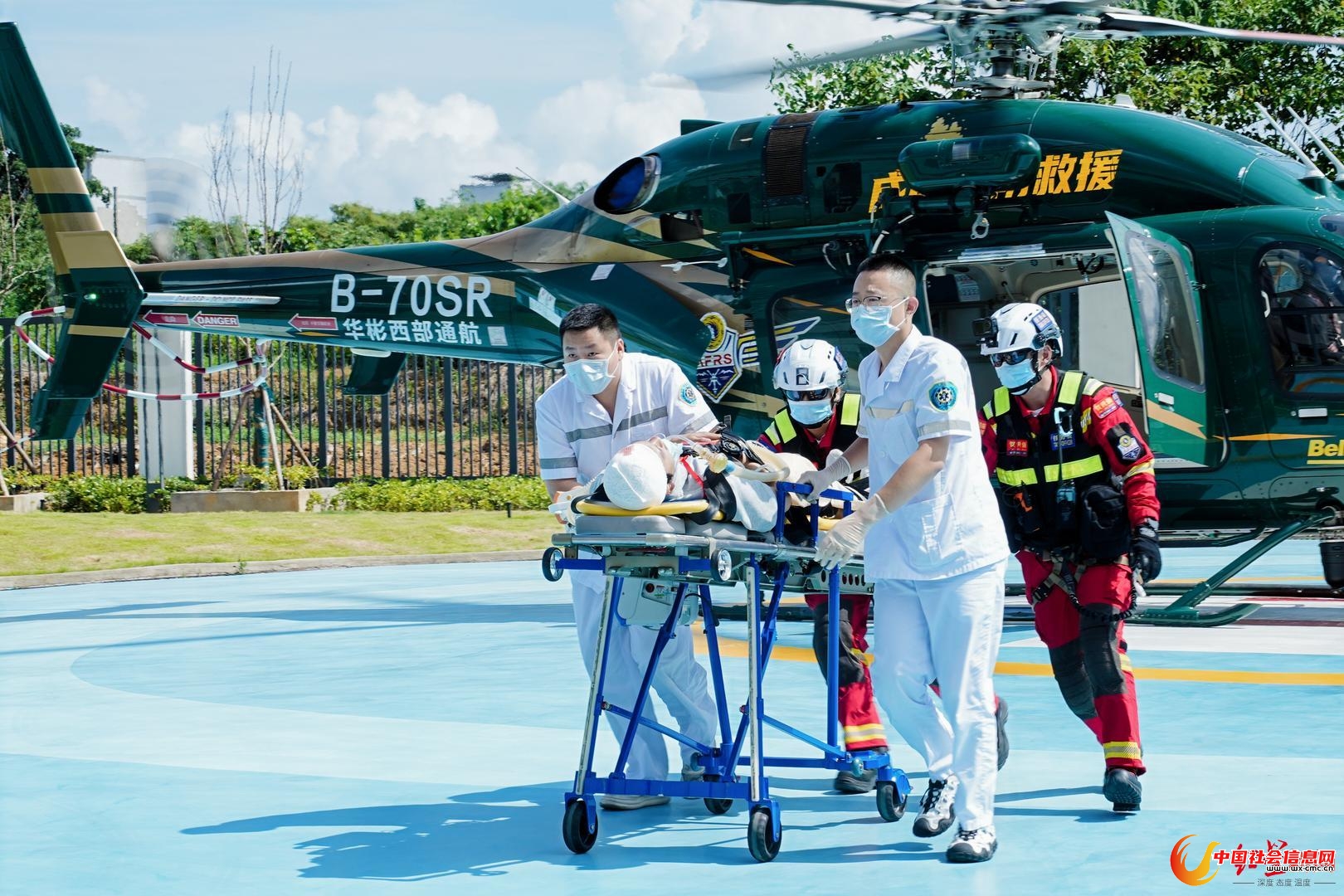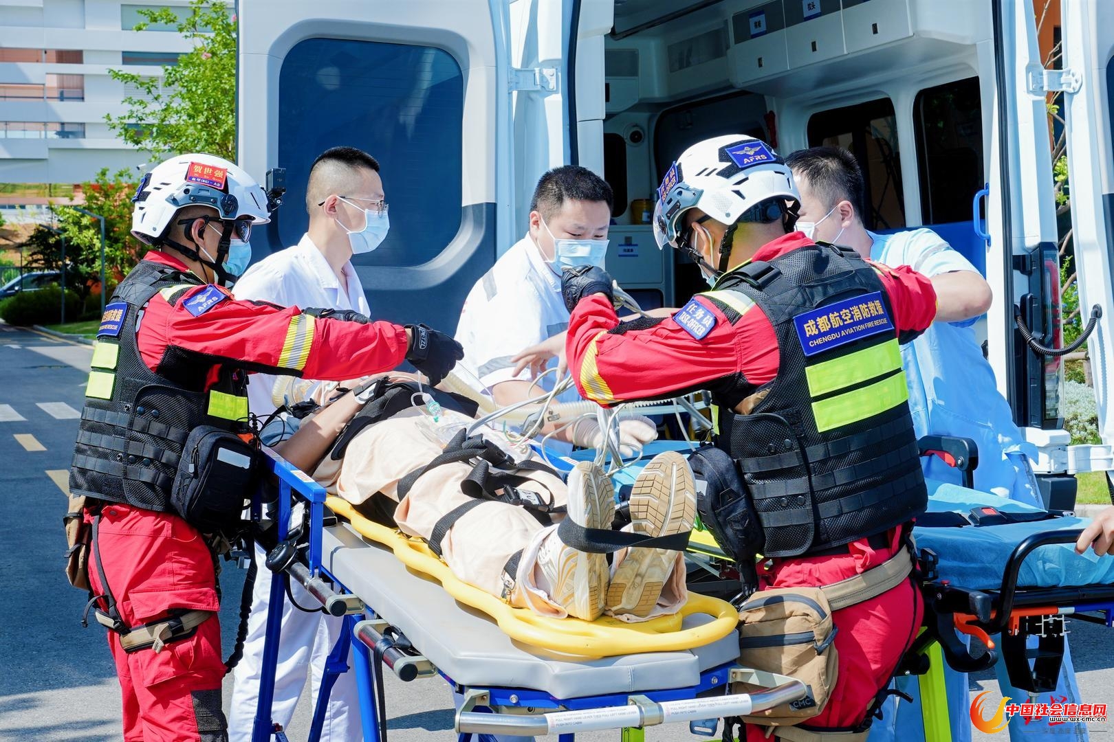 适逢成都世运会即将到来,签约仪式结束后,由成都世运会执委会保障部、成都市卫健委、成都市消防救援支队联合主办的“2025年‘医消联勤·护航世运’成都世运会航空医疗救援联合演练”正式展开,演练模拟突发事件造成多人受伤场景,因交通拥堵导致地面救援力量无法到达现场,立即启动航空救援。