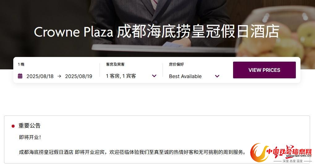 微成都报道8月18日,微成都注意到,IHG(洲际酒店集团)官网显示,成都海底捞皇冠假日酒店(下称“海底捞皇冠酒店”)即将开业迎宾。接近该项目的人士向微成都确认,该酒店为海底捞与洲际合作的项目。