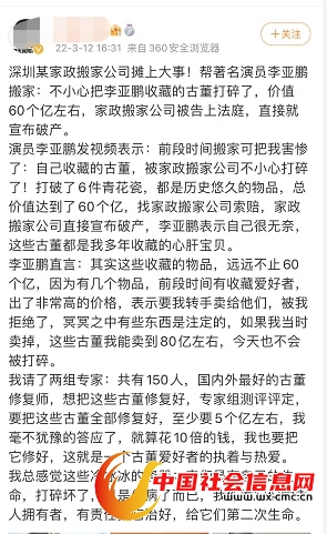 更魔幻的是有营销号爆料某家政公司帮他搬家,不小心把他收藏的古董打碎了,价值六十个亿。家政公司被告上法庭,直接宣布破产。