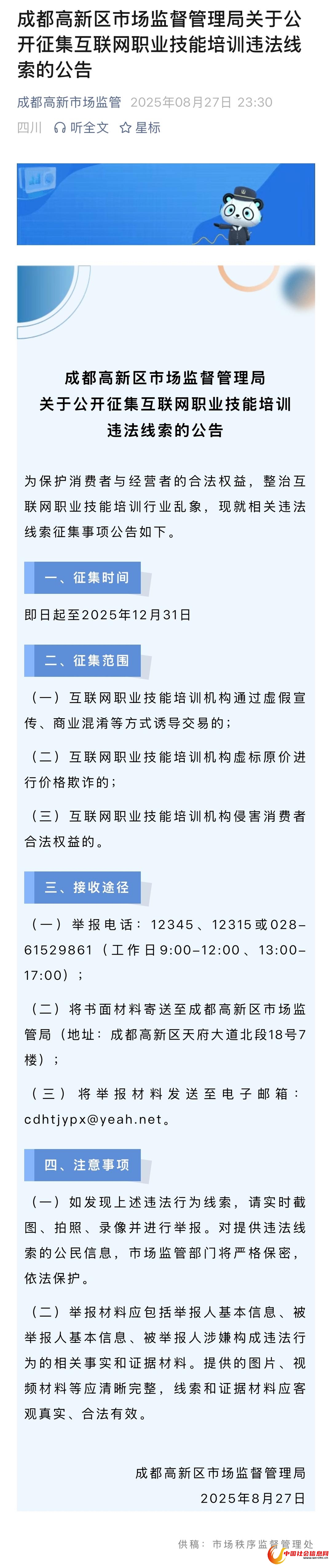 据介绍,此次违法线索征集,涉及互联网职业技能培训的违法线索均可进行举报。目前他们已通过公开征集接到一两百件相关线索,大多涉及培训公司虚假宣传、欺诈、不正当竞争等。针对这些问题,成都高新区市场监管局将依法依规进行处理。