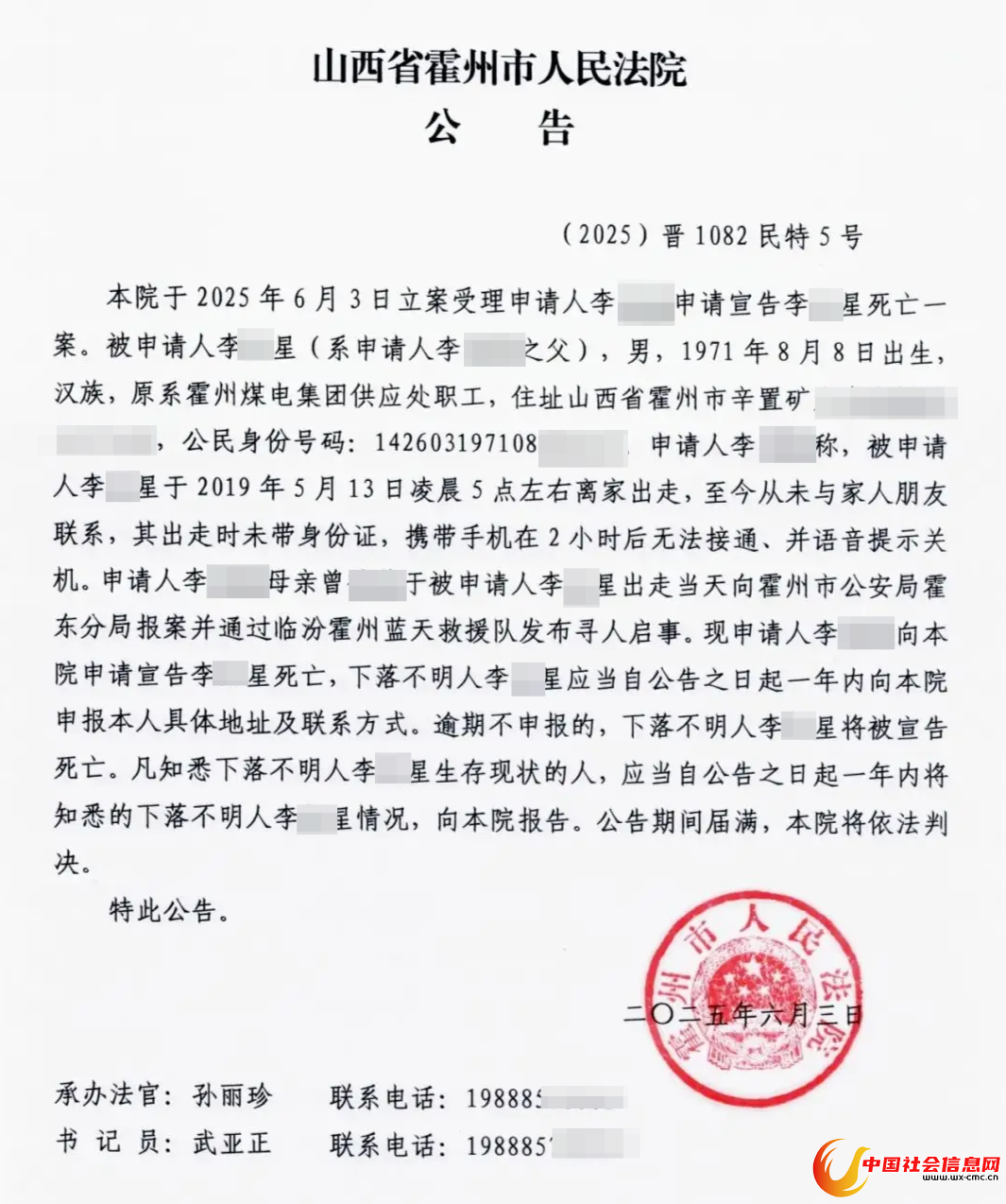 近日,山西省霍州市人民法院依法发布公告,正式受理李某某申请宣告其父亲李某星死亡的案件。