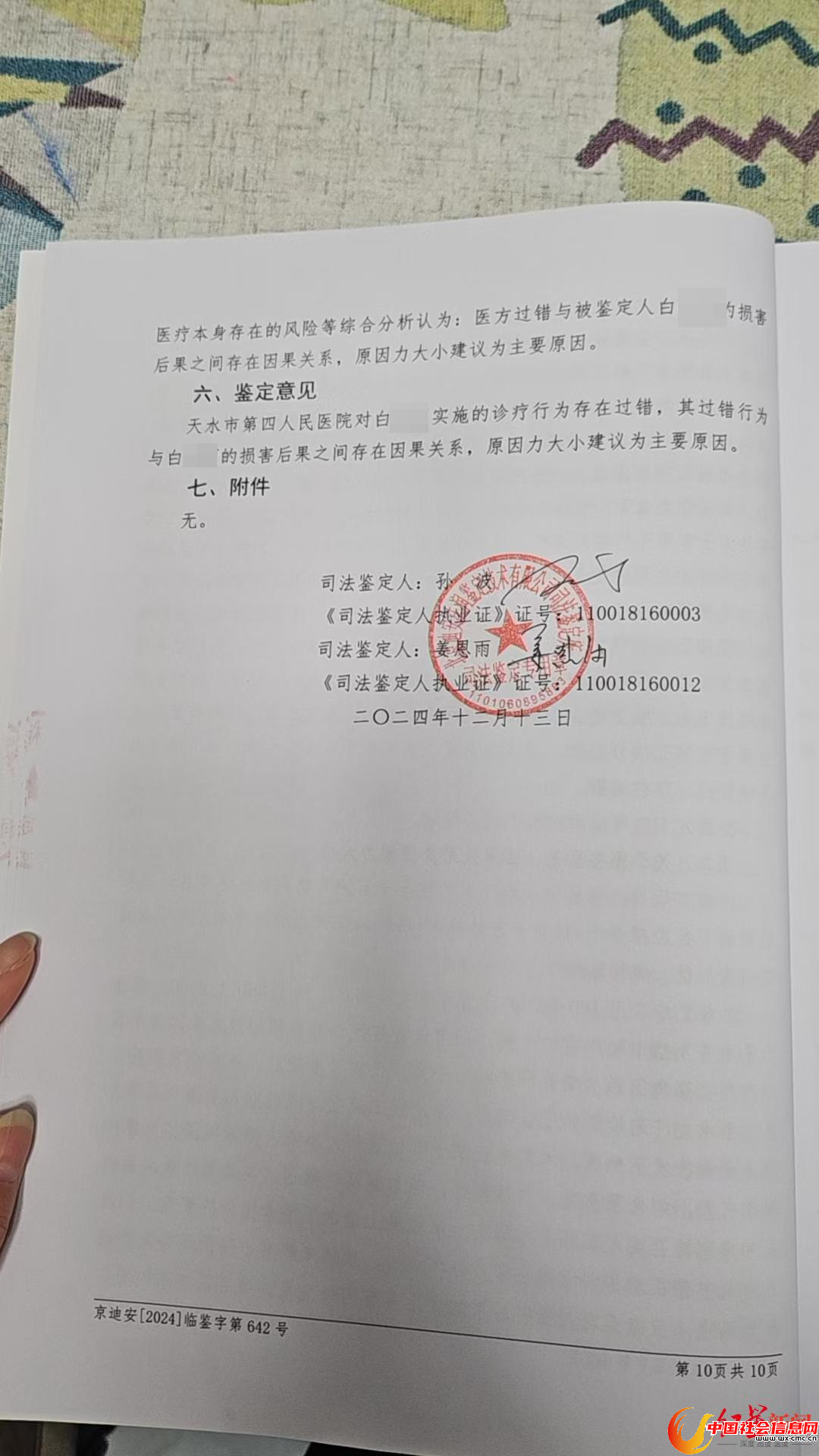 白女士提供的司法鉴定书显示,2024年12月13日,鉴定意见为天水市第四人民医院对白女士实施的诊疗行为存在过错,其过错行为与白女士的损害后果之间存在因果关系,原因力大小建议为主要原因。